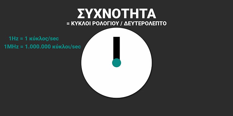 Η συχνότητα που όλοι ξέρουμε και μετράται σε Megaherz (MHz) είναι στην πραγματικότητα η ταχύτητα αυτού του ρολογιού. Μας δείχνει δηλαδή πόσους κύκλους ρολογιού έχουμε ανά δευτερόλεπτο.