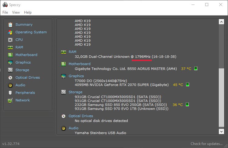 Στο παράδειγμα της εικόνας, οι μνήμες πωλούνται ως 3600MHz, αλλά το Speccy αναφέρει 1796MHz, που είναι το μισό.